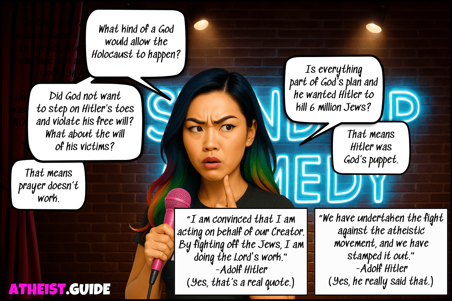 If you believe God allowed the Holocaust to happen because Hitler was part of God’s great plan, and everything happens for a reason, we just can’t see the silver lining, then you agree with Hitler. He said exactly the same thing.